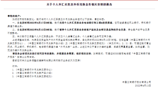 4月13日,工商银行官网发布关于个人外汇买卖及外币兑换业务相关安排的通告:自北京时间2022年4月17日0时起,我行关闭个人外汇买卖业务电话银行和工银E投资渠道。自北京时间2022年6月12日0时起,我行暂停个人外汇买卖业务新客户签约及全部交易品种的开仓交易,持仓客户的平仓交易不受影响。