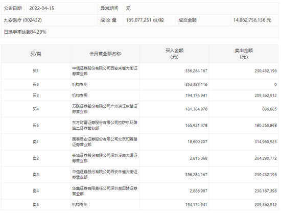 具体来看,两家机构席位现身九安医疗今日龙虎榜,其中一家机构单边买入3.53亿元,另一家机构买入1.94亿元的同时卖出2.09亿元。