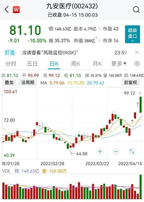 在急速拉升后,九安医疗在历史高位收出放量“天地板”,这一形态在不少投资者看来并不乐观。有投资者在“股吧”中发帖,称149亿元的天量显示主力资金应该明显“出货”了。