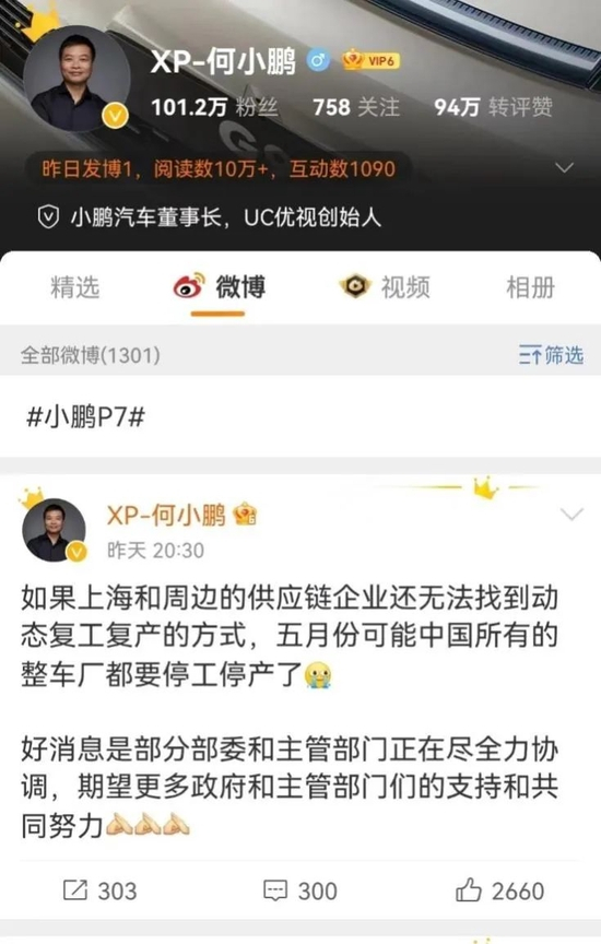 14日晚间,小鹏汽车创始人何小鹏在微博发声,称“如果上海和周边的供应链企业无法找到动态复工复产的方式,五月份可能中国所有整车厂都要停工停产了”。但何小鹏也补充道,“好消息是部分部委和主管部门正在尽全力协调。”
