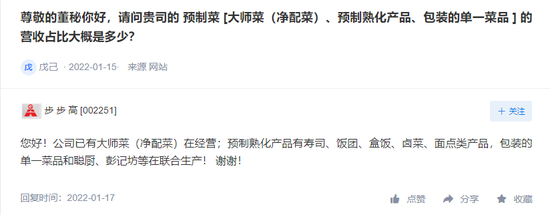 公司此前在互动平台回复投资者提问时表示:公司已有大师菜(净配菜)在经营;预制熟化产品有寿司、饭团、盒饭、卤菜、面点类产品,包装的单一菜品和聪厨、彭记坊等在联合生产。