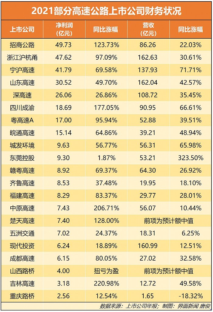 高速公路上市公司2021年收入大涨,部分企业利润翻倍