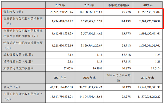 年报显示,龙佰集团2021年实现营业收入205.66亿元,同比增长45.77%;实现净利润46.76亿元,同比增长104.33%,双双创下公司自2011年上市以来最高水平。