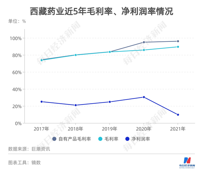 《每日经济新闻》记者注意到,自2008年以来,西藏药业自有产品毛利率超过70%,部分年份(如2020年、2021年)的毛利率甚至超过90%,但西藏药业的销售净利润率远远低于其销售毛利率,最高时超过30%,最低时在20%徘徊(2021年因为大幅减值影响利润,数据进行剔除)。