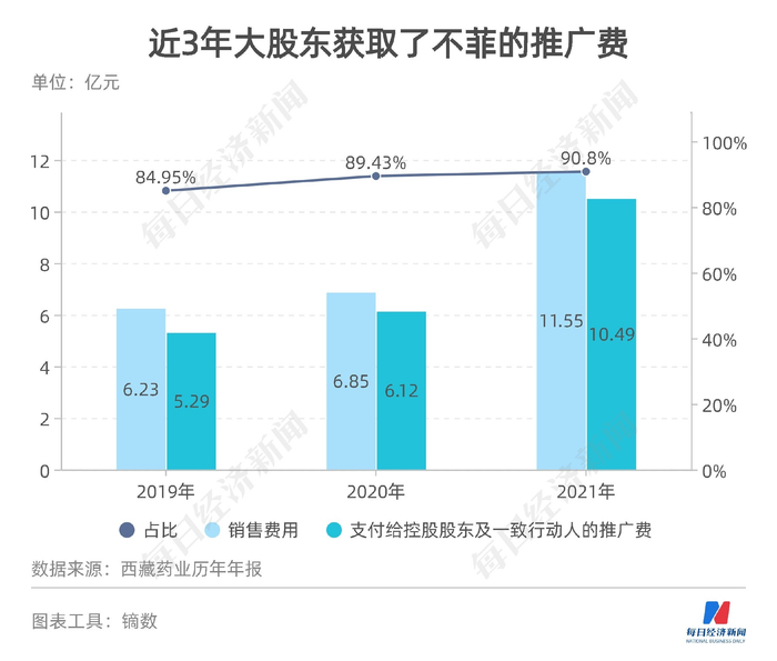 2021年,公司销售费用为11.55亿元,同比增长68.71%,高于收入增速;销售费用率达到54.0%,相比2020年提升4.15个百分点,创下历史最高值。在2021年的市场费用中,10.49亿元是支付给康哲药业下属公司的药品推广服务费,169.8万元是支付给康哲药业下属公司的药品商务服务费。近3年,在西藏药业的巨额销售费用中,有超过8成都以推广费的形式支付给控股股东及其关联企业。