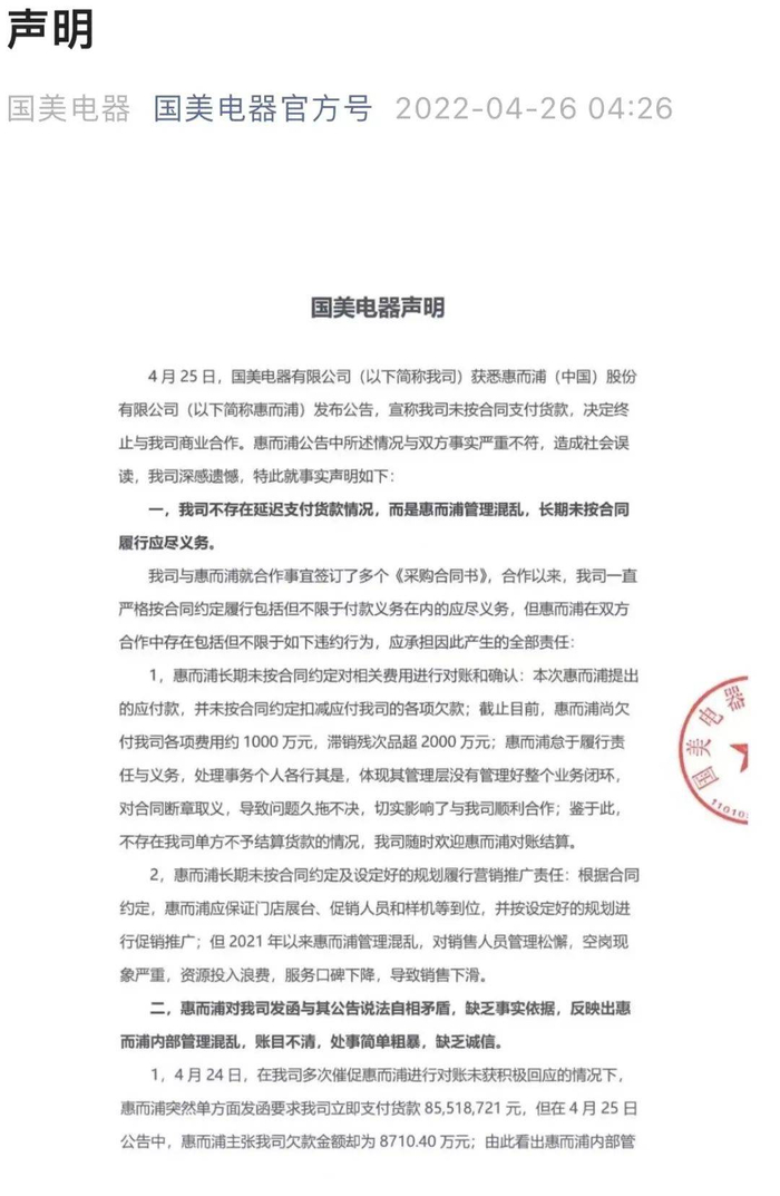 国美电器称,惠而浦所述情况与事实严重不符,国美不存在延迟支付货款情况,而是惠而浦长期未按合约进行对账,未及时扣减滞销残次品等费用,导致问题久拖不决。此外,惠而浦管理混乱,4月24日给国美发函要求支付的货款为8551万元,公告中要求支付的货款为8710万元,自身账目不清,处理事情简单粗暴。