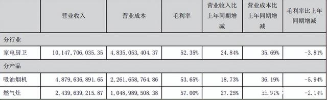 从老板电器财报数据也可以看出,家电厨卫的制造费用同比增长62.09%,原材料费用同比增长36.23%。与此同时,家电厨卫的毛利率同比减少3.81%,其中吸油烟机毛利率同比减少5.94%,燃气灶毛利率同比减少2.41%,这两项产品相加已经占了总营收的72.13%。