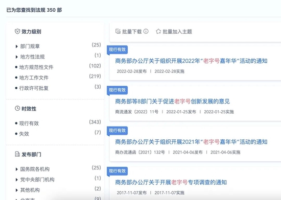 北京时择律师事务所刘云律师提到,从现有材料上看,2005-2022年,国家每年都有开展老字号发展情况的调研。很多省市也专门发了关于认定、开展、保护老字号的活动或通知。现行有效的相关法规达343部。