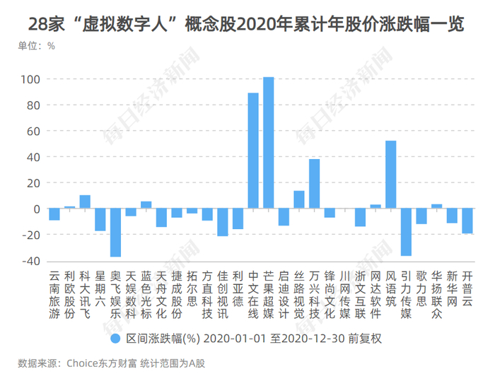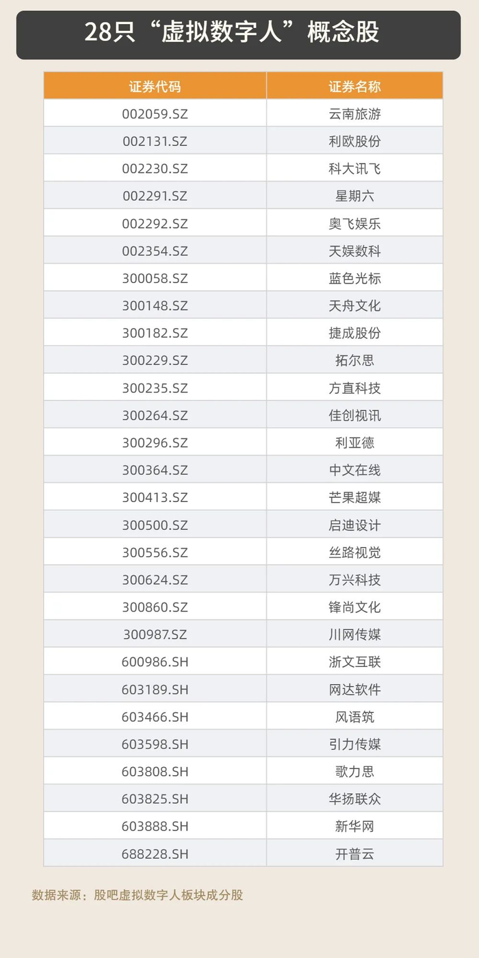 板块热度带动下,每经记者注意到,板块内28只“虚拟数字人”概念股在资本市场也备受追捧,股价和市值波动明显。