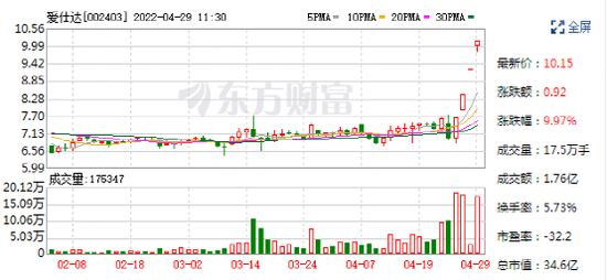 由孙俪连续代言11年的厨具家电品牌爱仕达,近期股价走势也引人侧目。自4月26日以来连续三日涨停后,虽然曝出业绩亏损的成绩单,但股价依然不受影响,今日再度涨停,成功录得4天4板,惹得股民直呼“看不懂”。