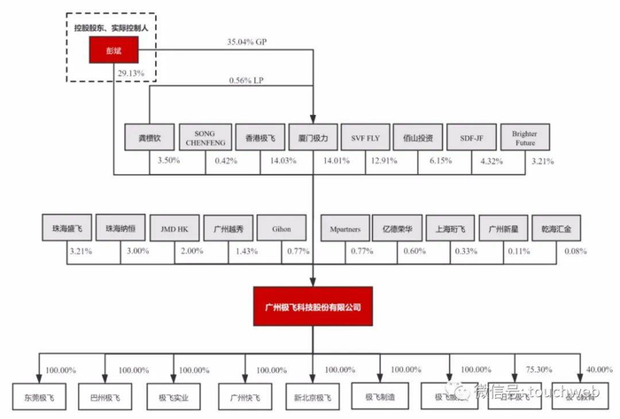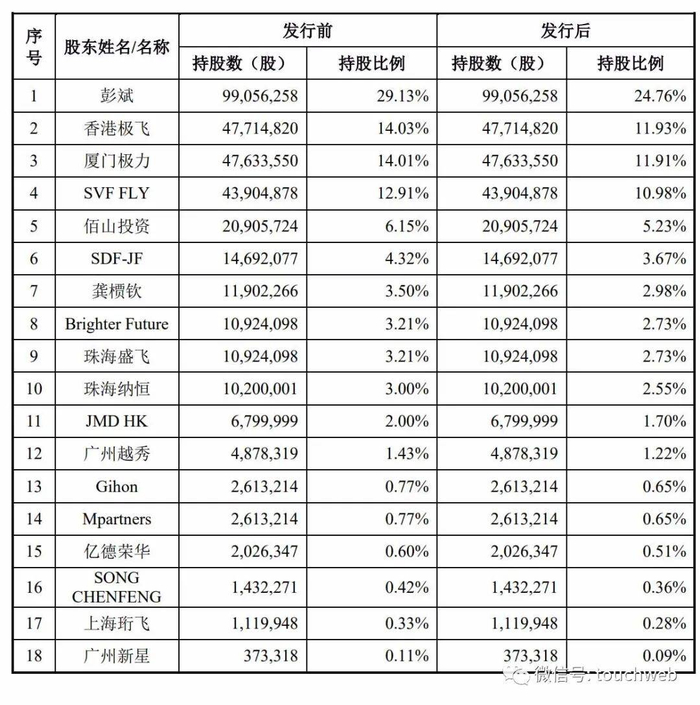 IPO前,彭斌持股29.13%,香港极飞持股14.03%,厦门极力持股14%,SVF FLY持股12.91%,佰山投资持股6.15%,SDF-JF持股4.31%;
