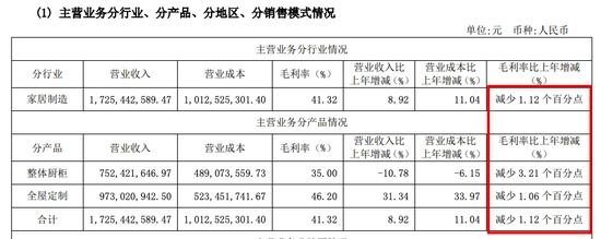 营收中,产品类别方面,全屋定制实现收入97,302.09万元,较上年同期增加31.34%,占营业收入比重56.39%;整体厨柜实现收入75,242.17万元,较上年同期减少10.78%,占营业收入比重43.61%。在销售渠道类别方面,经销业务实现收入107,719.99万元,较上年同期增加10.43%,占全渠道业务收入比重62.43%;直营零售业务实现收入31,645.44万元,较上年同期增加48.07%,占全渠道业务收入比重18.34%;大宗业务实现收入32,652.28万元,较上期减少16.26%,占全渠道业务收入比重18.92%。