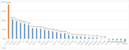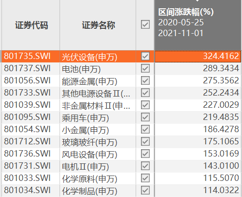 上图是在大盘技术性回调前,申万一级行业板块从2020年年中至2021年年底的区间行情,可见,电力设备独占鳌头,以186%的涨幅领跑;而根据申万二级行业中,光伏设备板块的表现更是“皇冠上的明珠”,以320%左右的涨幅跑赢了近两年的大热门板块锂电池。