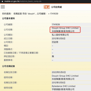 香港公司注册处网站显示,字节跳动(香港)有限公司已更名为抖音集团(香港)有限公司,生效时间为2022年5月6日。此外,字节跳动旗下其他数个公司也陆续更名为“抖音”。天眼查显示,字节跳动有限公司更名为抖音有限公司。据国家企业信用信息公示系统,北京字节跳动科技有限公司更名为北京抖音信息服务有限公司。