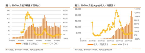 据第一财经记者了解,从业务来看,国内抖音、国外TikTok组成字节跳动营收核心支撑。天风证券报告显示,2016年以来,TikTok下载量和月度App内收入持续快速提升。2017年收购 Musical.ly带来第一波用户增长高峰,2020年疫情影响带来第二波用户增长高峰,同时激发用户付费潜力,2020年月均App内收入0.75亿美元,同比增长604.51%,开启TikTok App 内付费时代,高增延续至今,2021年TikTok月均下载量0.62亿次,月均App内收入1.3亿美元。