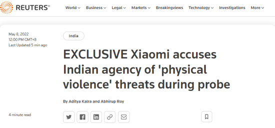 5月8日,据路透社消息,小米公司称其高层管理人员在接受印度金融犯罪打击机构的询问时面临“人身暴力”的威胁。
