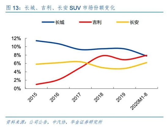 如上图所示,从2015年到2020年,我们看到与长城的缓慢下移相比,红色的吉利则是急速上升,最终完全抹平与原先高高在上的长城的距离,下面还有个长安在虎视眈眈。