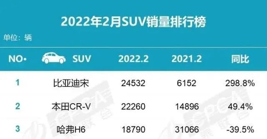 据乘联会数据,2022年2月,哈弗H6被比亚迪宋和本田CR-V超越,仅排在SUV销量榜第三位。这意味着长城汽车依赖的SUV大本营开始全面失守。