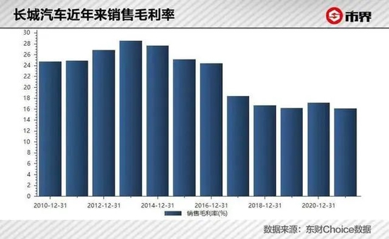 长城汽车历年财报显示,2013年长城汽车毛利润率达到28.61%的高点之后便持续下滑,2019年下降至16.83%,2020年微反弹至17.21%,而2021年毛利润率则下滑至16.16%。
