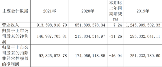 数据显示,2021年,均瑶健康的营业收入不到9.14亿元,与2020年8.52亿元相比,增长7%左右;归属于上市公司股东的净利润接近1.47亿元,相较于2020年2.14亿元,下滑31%左右;归属于上市公司股东的扣除非经常性损益的净利润约为0.93亿元,与2020年1.75亿元相比,降幅在47%左右。