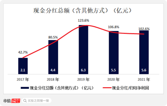 2019到2021这三年里,公司每年的现金分红占归母净利的比重都超过了100%,即使在疫情肆虐的2020年,依旧达到了107%。