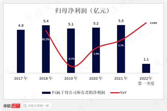 2021年归母净利润创了五年来的新高,达到5.5亿元,同比增长5.7%。2022年第一季度为1.1亿,同比增长13.8%。