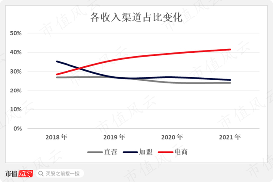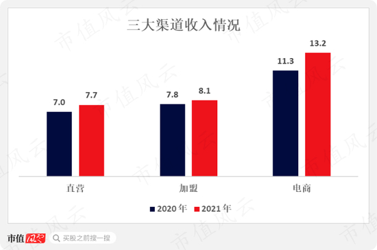 电商业务可以说是被公司寄予厚望,近几年的表现也优于直营与加盟。