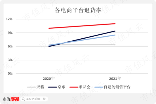 退货率方面,唯品会最高,达到了11%,其他各平台的退货率也有所上升,其中天猫最稳定,退货率仅上升了0.04个百分点。