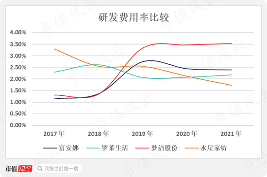 在研发费用率方面,目前位列一二名的依然是梦洁股份与富安娜。