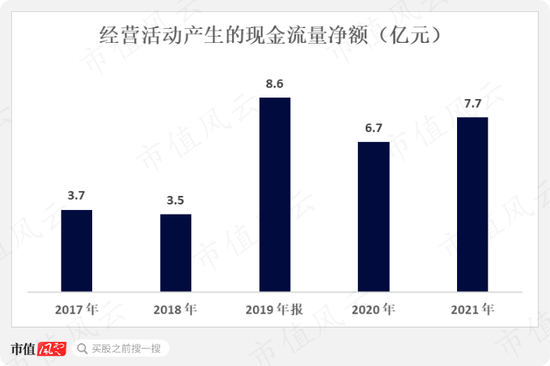 经营活动现金流量净额在2021年达到7.7亿,超越疫情期间的水平,但是和疫情前的最好表现仍存在一定的差距。