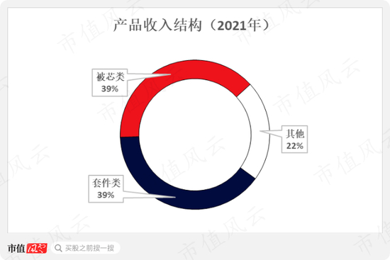 公司的主要产品类别为纺织类,家具只占到了总营收的3%。在纺织类产品中,“套件类”与“被芯类”又最为重要,二者在总营收中的占比合计超过70%。