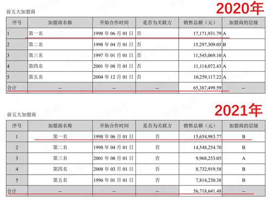 这种情况同样出现在加盟商处,销售额第一的加盟商、前五名加盟商合计销售额都在下降。