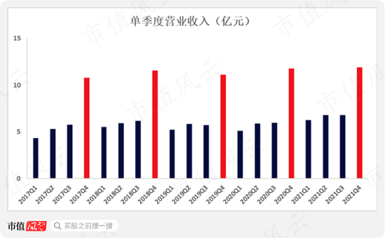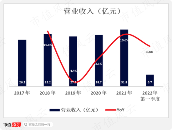 公司近五年的营收在成长性方面略显不足,2021年首次突破30亿,同比增长10.6%。2022年第一季度营收6.7亿元,同比增长6.8%。