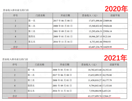 例如收入排名前五的直营门店平均平效,它们并没有因为消费复苏而有所提升,而是出现了下降,从14430元/平降至12364元/平。