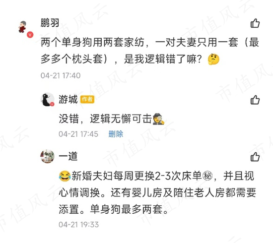 正巧,在市值风云APP社区里,有许多小伙伴对此现象也有不同的看法:当今结婚率的下降对于家纺行业在某种程度上甚至是利好,逻辑十分新奇甚至让人无法反驳。