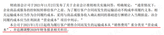 这是因为公司于2021年1月1日起,将“销售费用”中的“运输成本”划分至了“营业成本”,使得毛利率有所下降。