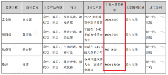 富安娜给自己的产品定位是“高端家纺”,旗下一共有四个原创自有品牌,虽然无一例外都是床上套件、被芯、枕芯、家居,但是各有各的定位。