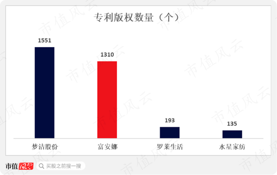 当然,这附加值也不是空口说白话,就以富安娜所拥有的专利版权数量来看,仅次于梦洁股份,比罗莱生活和水星家纺的合计数都要多得多。