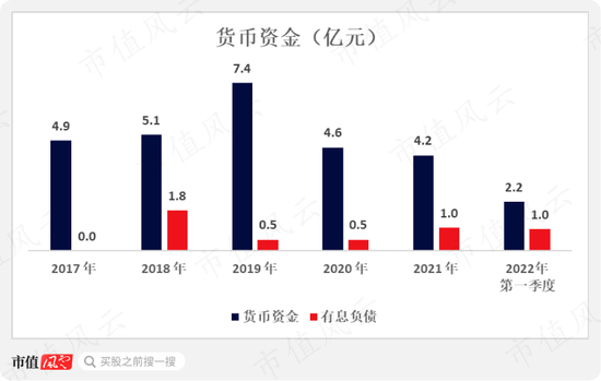 公司账面上的货币资金在2019年到2021年里逐年减少,从7.4亿元下降到去年年末的4.2亿元。在2022年第一季度则继续下降至2.2亿元。