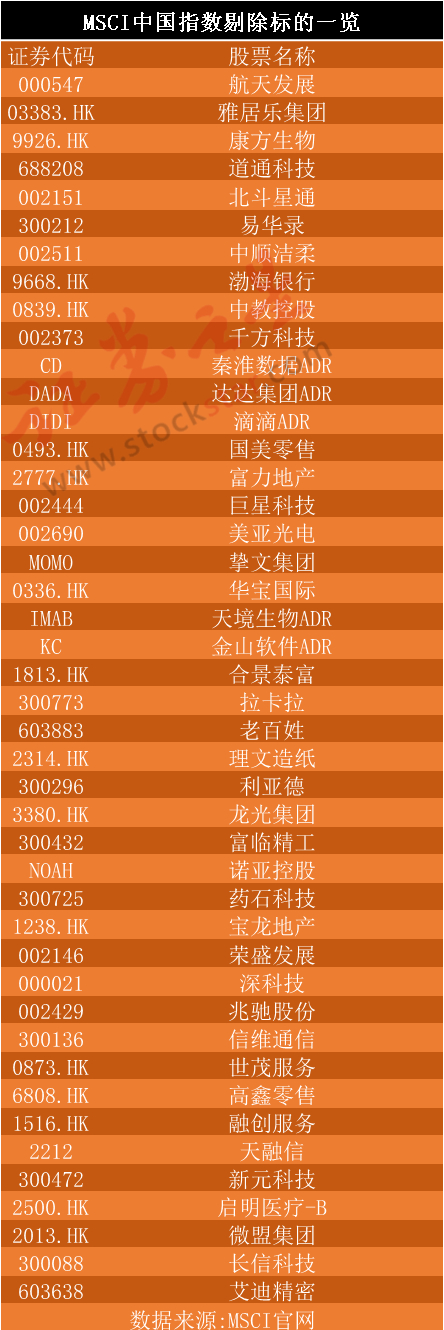 除新纳入股票之外,MSCI中国指数本次剔除了44只中国股票,其中包括21只A股。遭到剔除的股票有航天发展、雅居乐集团、康方生物、道通科技、北斗星通等。
