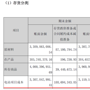 在公司存货中,原材料、库存商品和电站项目成本都大幅攀升,其中电站项目账面余额33.08亿,同比增幅高达437.53%。