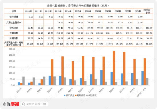 2017年以来,云天化的货币资金都在百亿或接近百亿,但同时短期借款都在200亿元以上。