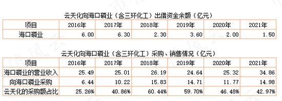 2016年以来,持续向海口磷业出借资金,同时上市公司不断增加对海口磷业的采购,从2016年的6.44亿元增加至2021年的15亿元,该采购额一度占到海口磷业营业收入的60%。