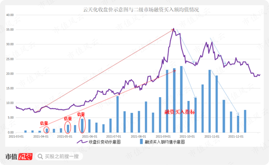 云天化股价从2021年1月的6元启动,到同年9月涨到37.2元,区间涨幅一度达500%;同期融资余额从3.5亿元、日均买入均值2600万元(最近5个交易日均值),增长到融资余额34亿元,日均买入均值达8.8亿元(最近5个交易日均值),融资余额增加近10倍,日均融资买入均值增加近34倍。