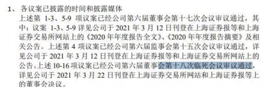 中航重机在《关于2020年年度股东大会增加临时提案的公告》中,也出现“上述10-16项议案已经公司第六届董事会第十八次临死会议审议通过”。