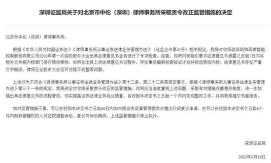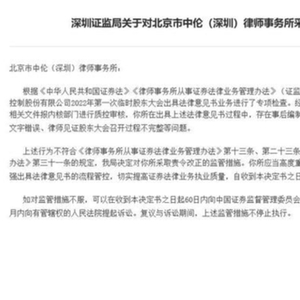 据了解,5月17日,深圳证监局对该所开展现场检查。针对检查发现的问题,深圳证监局5月18日依法对该所采取责令改正的监管措施,对三名律师采取出具警示函的监管措施。