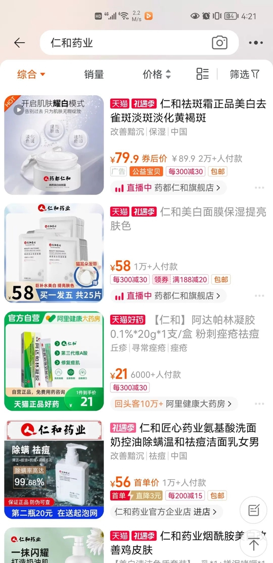 记者在淘宝等电商平台上搜索仁和药业,即跳出面膜、祛斑霜、洁面乳、额头贴、减肥药、防脱洗发水等各种五花八门的产品。