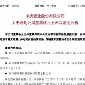 5月17日晚,中房置业股份有限公司发布公告称,上交所日前发来了《关于中房置业股份有限公司股票终止上市的决定》,上海证券交易所决定终止公司股票上市。