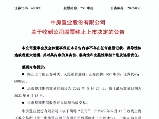 中房股份被终止上市,将进入退市整理期!