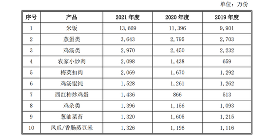 吃货们可能更关心老乡鸡什么快餐卖得最火。在产品上,老乡鸡以肥西老母鸡汤产品为特色,以农家蒸蛋、红烧鸡杂、梅菜扣肉、农家小炒肉、鸡汁辣鱼等家常菜品为核心,后又逐步推出了老乡炒土鸡、毛豆烧土鸡、农家小炒肉、金汤酸菜鱼等新一代招牌产品。招股书显示,2021年老乡鸡卖得最多的是蒸蛋类和鸡汤类,一年卖出3000万份。